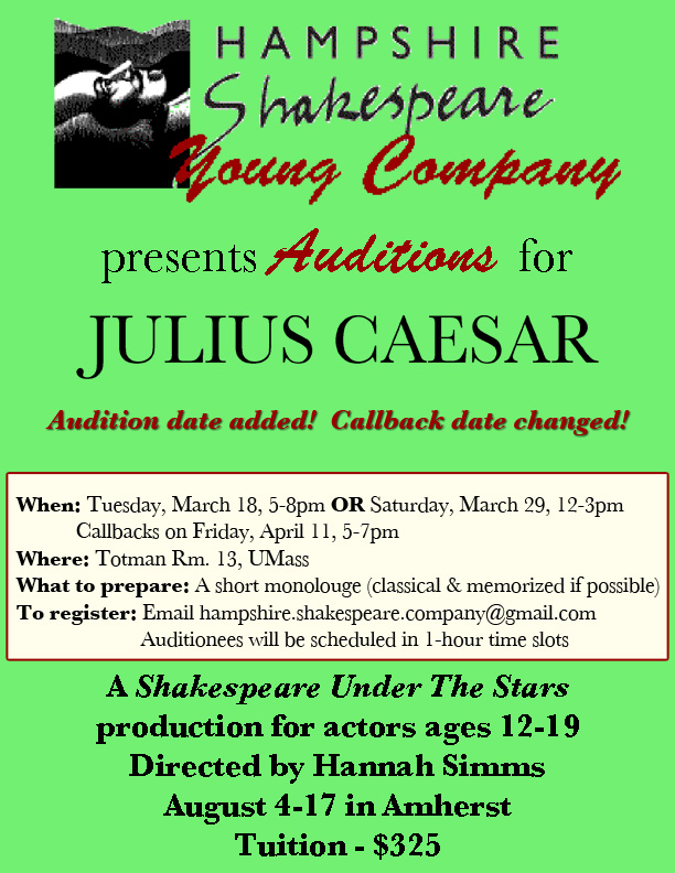 Jeffrey encourages actors to focus on clarity in the audition: clarity of speech and clarity of meaning. Roles will be double- and triple-cast. THE GENDERS OF A NUMBER OF CHARACTERS HAVE BEEN CHANGED TO FEMALE: Shakespeare calls for only 2 women, but this production has opportunities for 12 WOMEN (including some of the conspirators) and 14 MEN. Some smaller roles will be filled by actors from the company’s youth production of “Julius Caesar”.