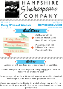 There’s still time to sign up for our upcoming March auditions for this summer’s season of Shakespeare Under the Stars! Email hampshire.shakespeare.company@gmail.com to reserve your ten-minute audition slot for either March 13th or March 16th. Callbacks will take place March 22nd.